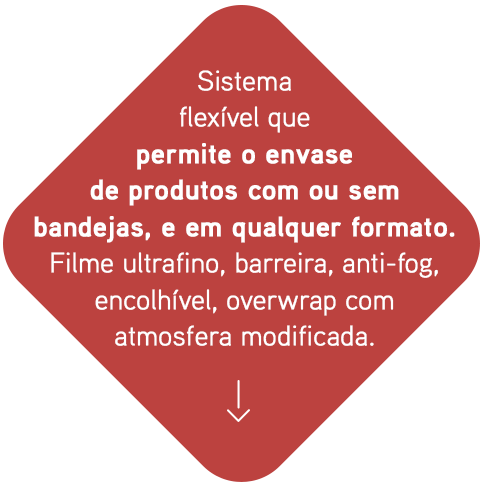 Sistema flexível que permite o envase de produtos com ou sem bandejas, e em qualquer formato. Filme ultrafino, barreira, anti-fog, encolhível, overwrap com atmosfera modificada.