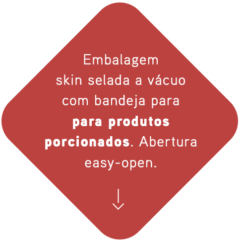Embalagem skin selada a vácuo em bandeja para produtos porcionados. Abertura easy-open.